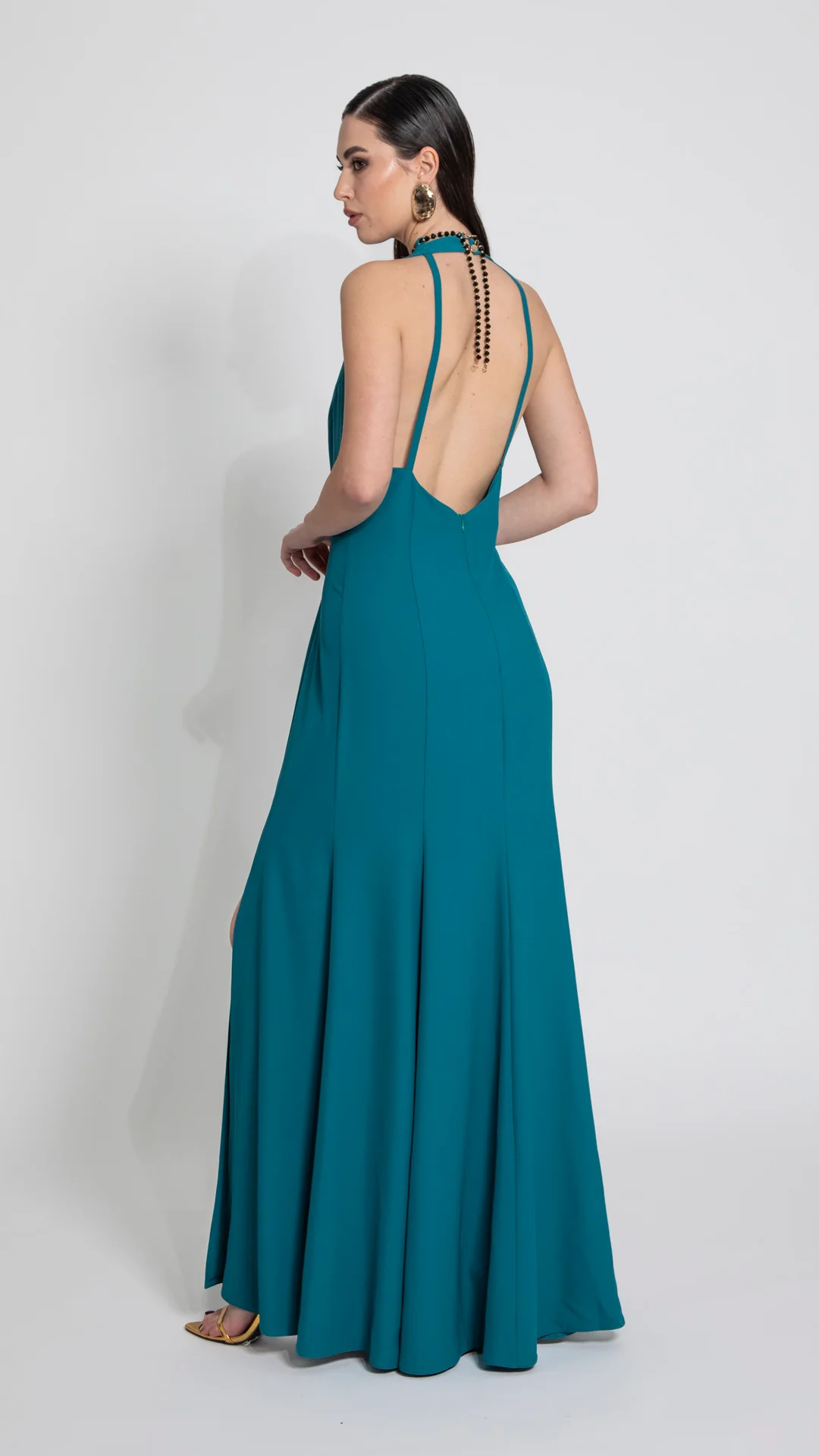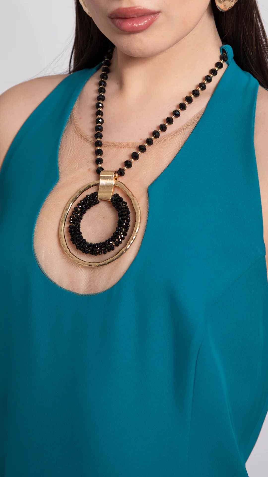 Abito sirena con accessorio collana in cadì. Tessuto fluido e strutturato. Design aderente con fondo svasato. Lunghezza lunga. Scollo rotondo. Senza maniche. Vestibilità regolare. Accessorio collana decorativo applicato. Linea elegante e femminile.