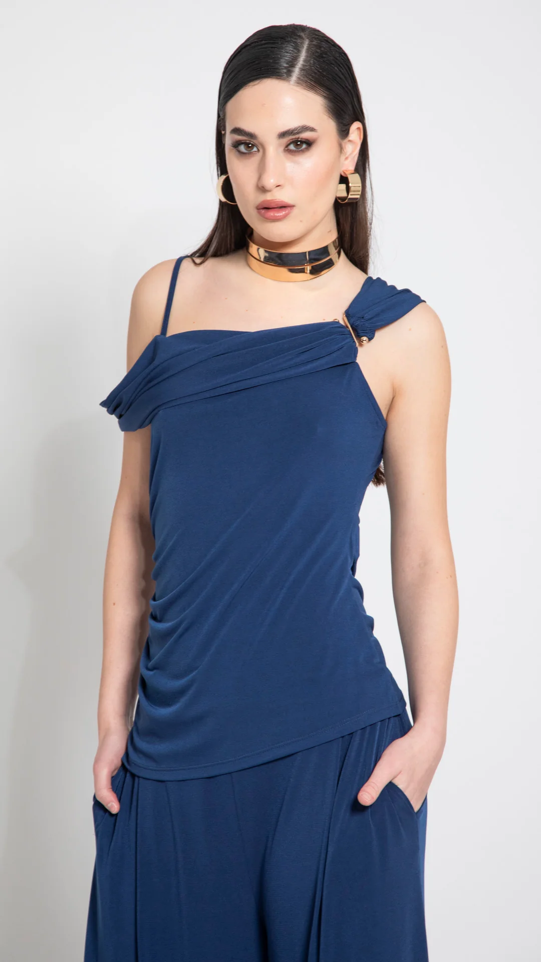 Top monospalla in jersey. Tessuto morbido e fluido. Design asimmetrico. Monospalla. Dettaglio drappeggio sul davanti. Vestibilità regolare. Linea femminile e contemporanea. Finiture curate. Chiusura senza zip.