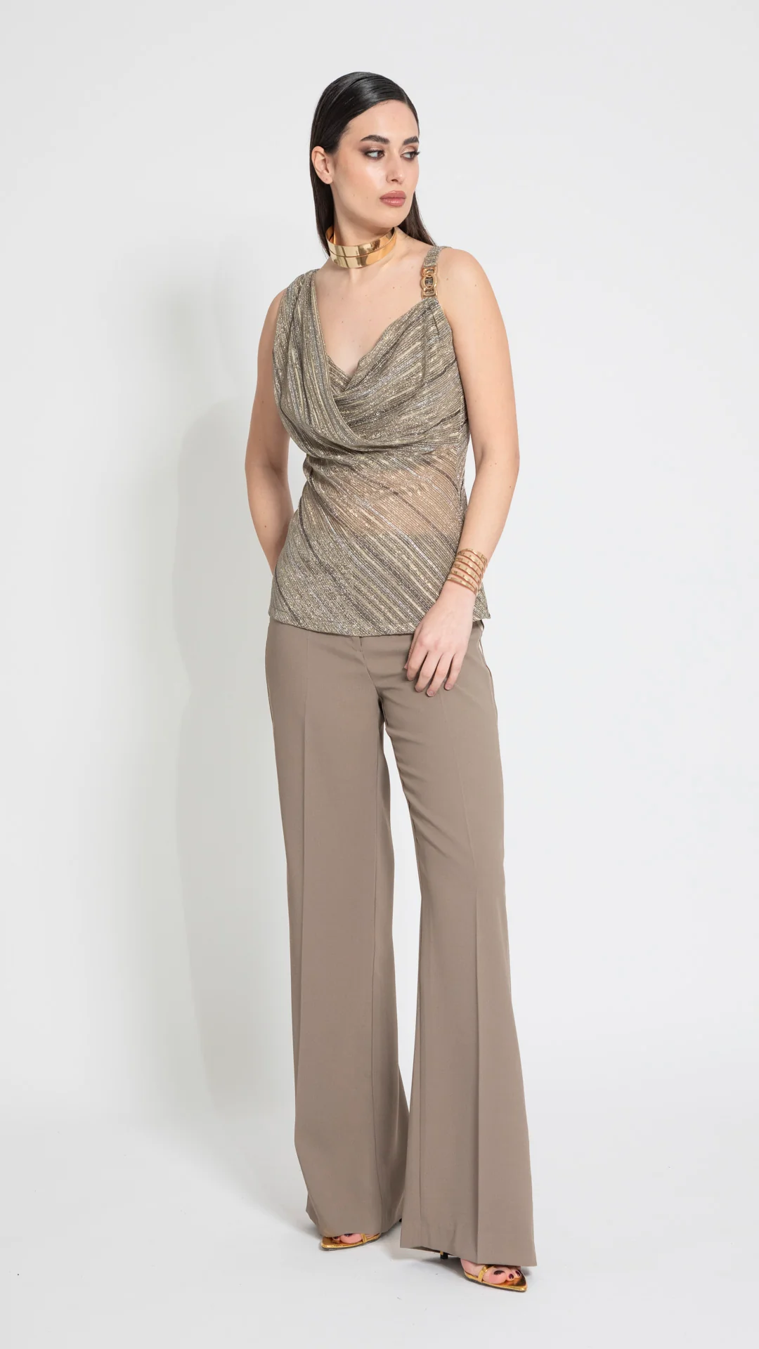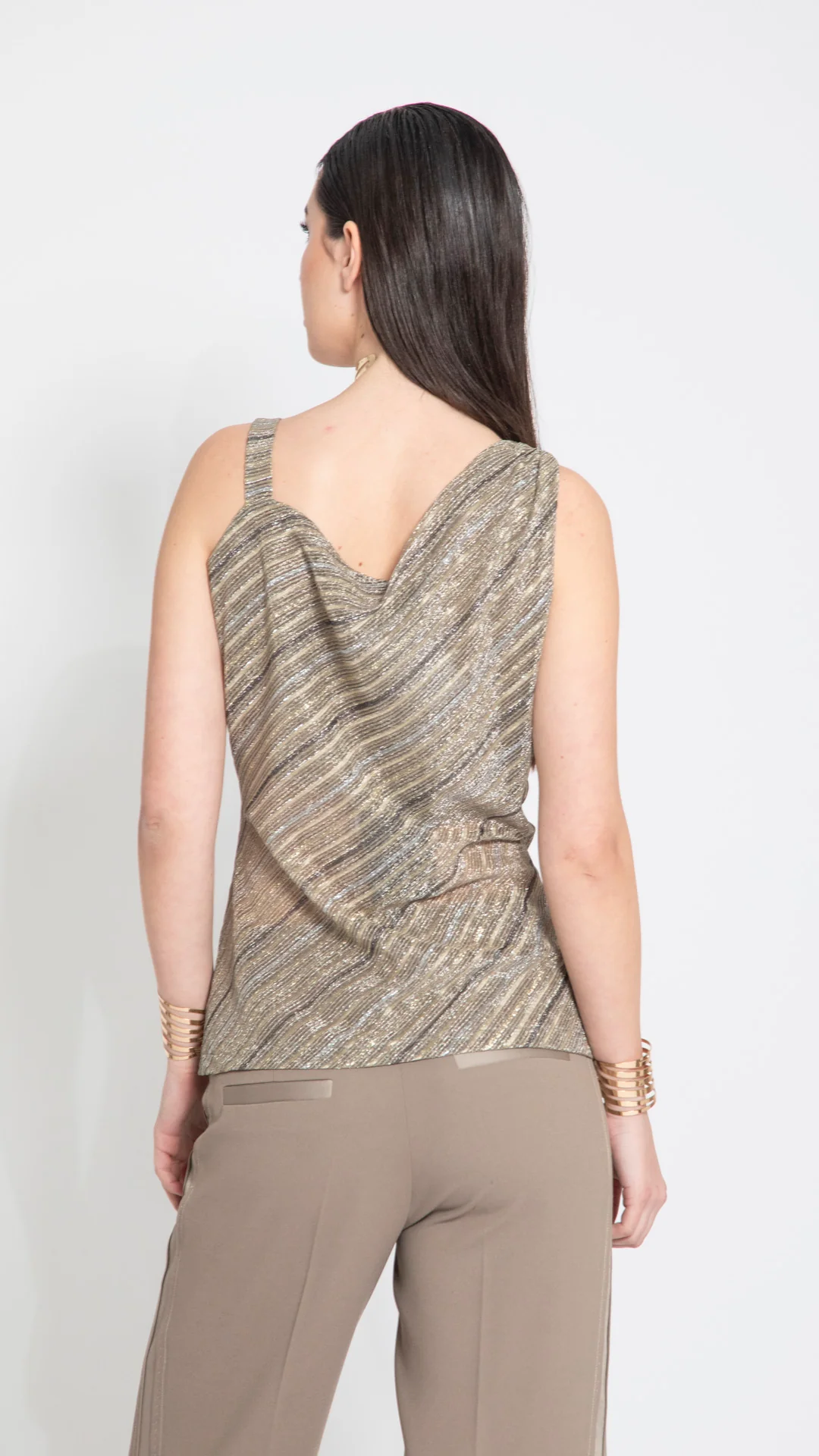 Top in jersey lurex rigato. Tessuto morbido e luminoso. Design dritto. Scollo rotondo. Senza maniche. Vestibilità regolare. Motivo rigato lurex all over. Linea femminile e brillante. Finiture curate.
