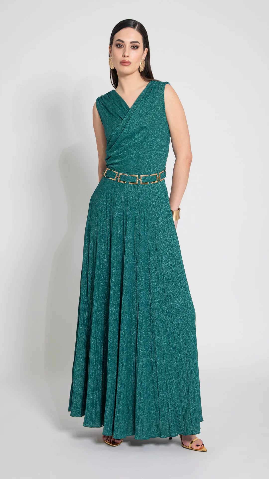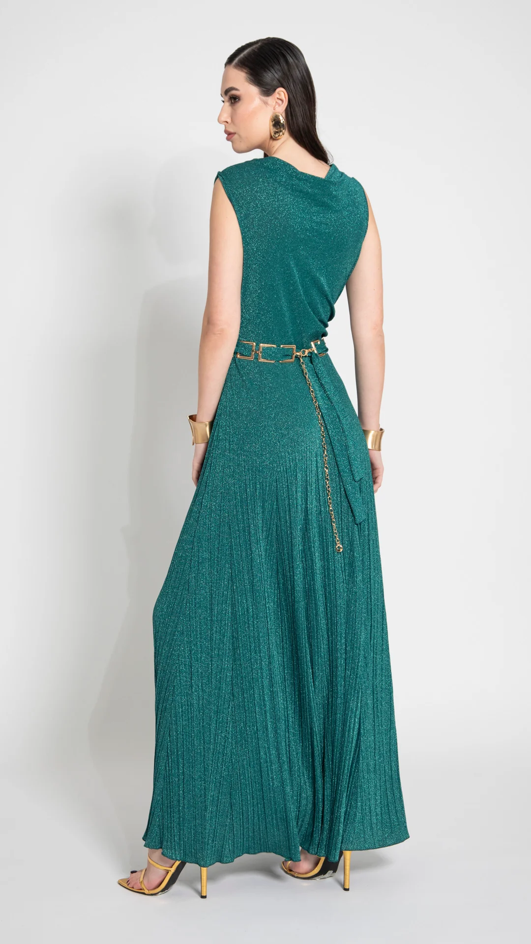 Abito midi plissé in jersey lurex unito. Tessuto morbido ed elasticizzato, luminoso al tatto. Design fluido. Lunghezza midi. Plissettatura regolare. Scollo rotondo. Maniche corte. Vestibilità regolare. Linea elegante e femminile. Finiture curate.