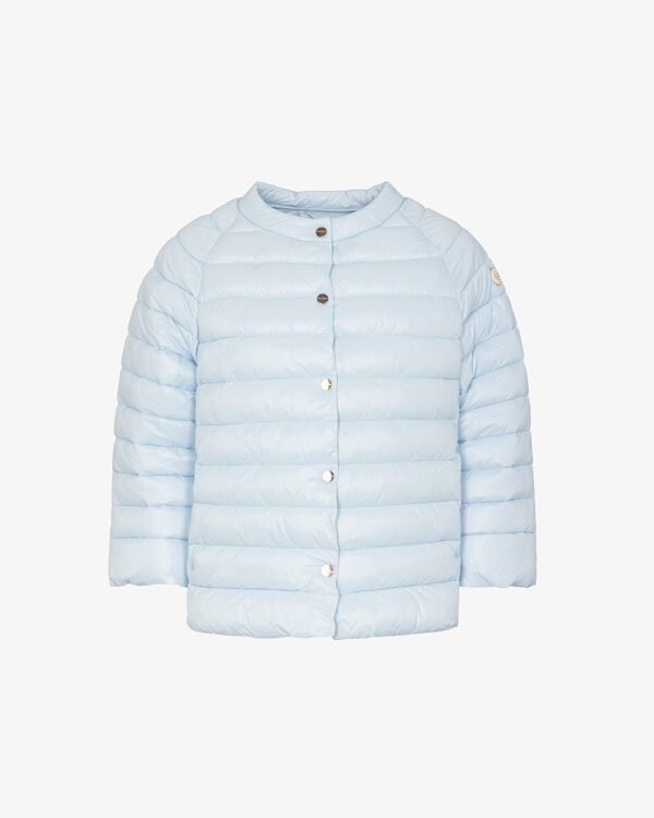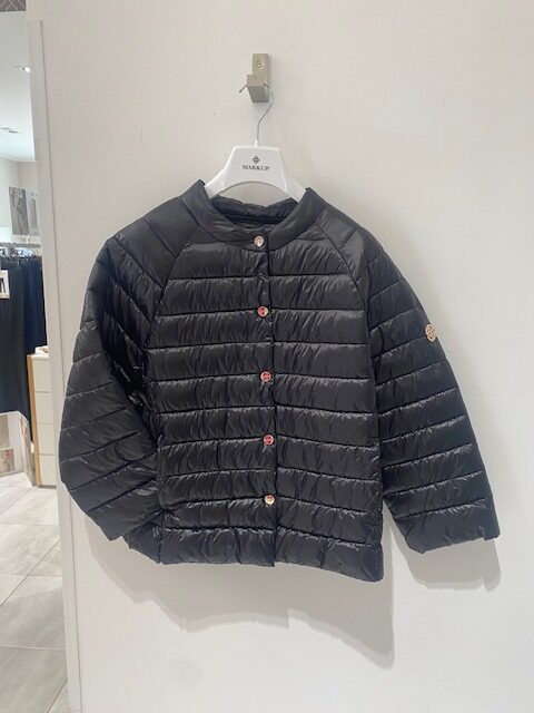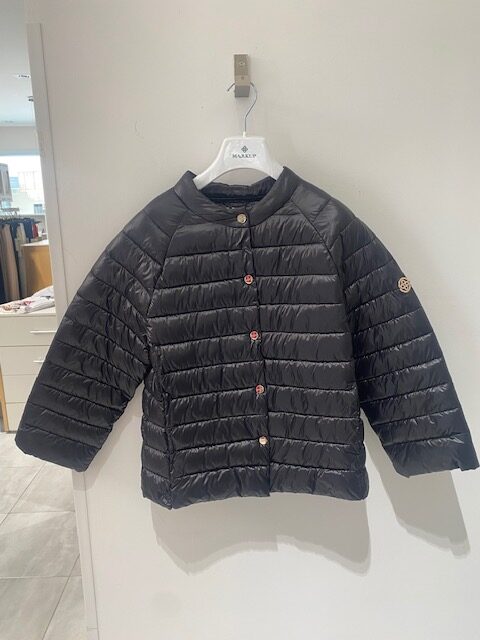 Piumino cappa corto manica 3/4 in nylon ultralight, collo coreano, apertura frontale con bottoni a pressione, tasche frontali inserite.