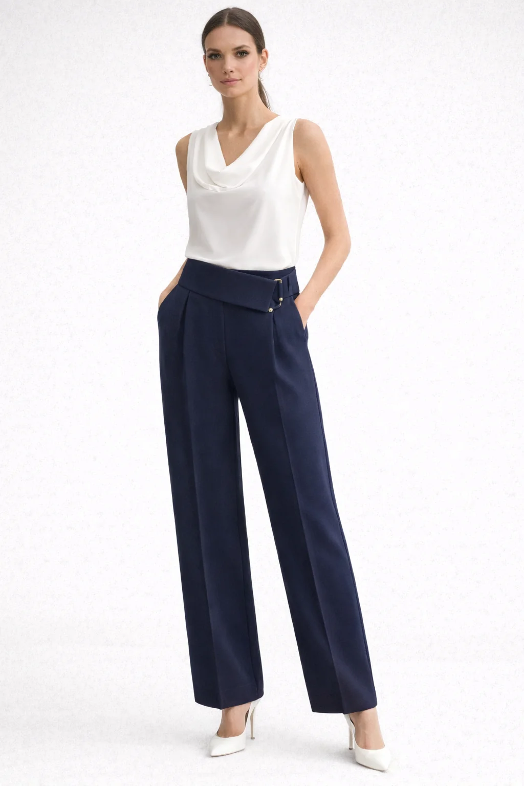 Pantalone largo con accessorio in scuba. Tessuto compatto ed elasticizzato. Design ampio. Vita regolare. Gamba lunga e fluida. Vestibilità regolare. Applicazione con accessorio decorativo in vita. Linea moderna ed elegante.